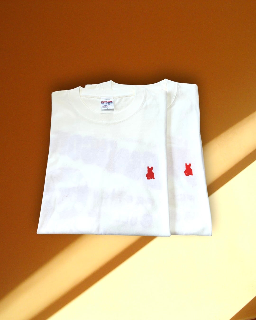 ヒト服のMサイズはレッド、Lサイズはオレンジのプリントで、表側にはフレブルのシルエットのワンポイントが!