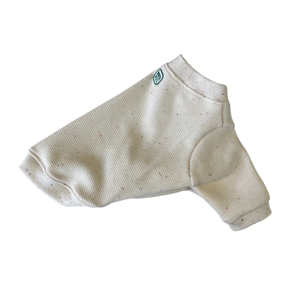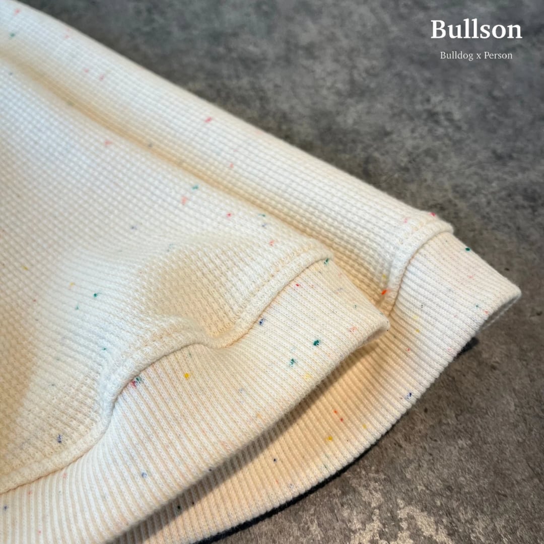 プツプツとカラーネップが入っているワッフル生地にワンポイントでワッペンが施されています。